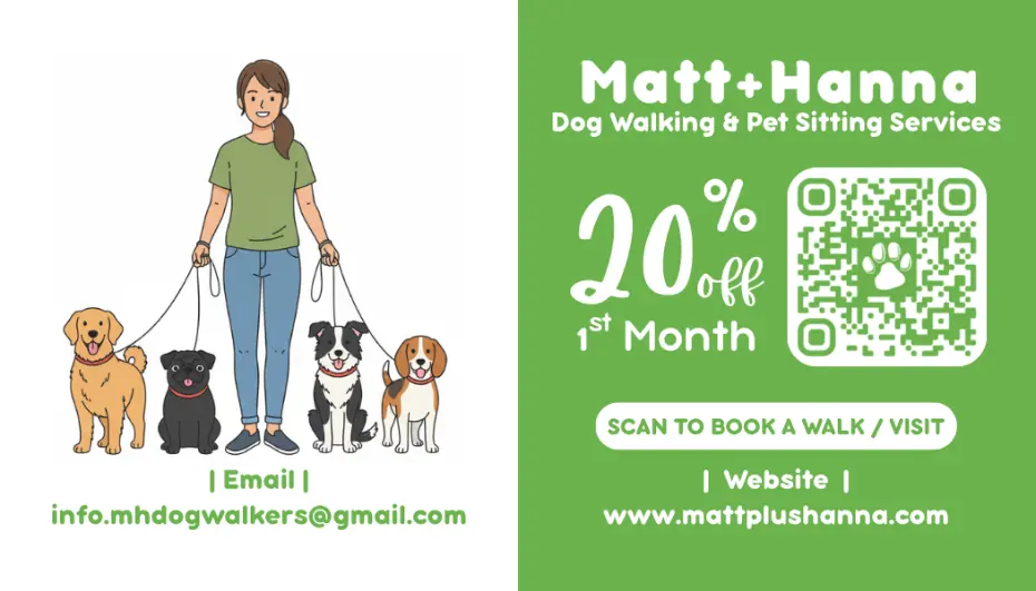 This offer is valid exclusively for new clients who have not previously booked dog walking / pet sitting services with Matt Plus Hanna. Existing clients or previous clients re-joining are not eligible for this specific promotion.